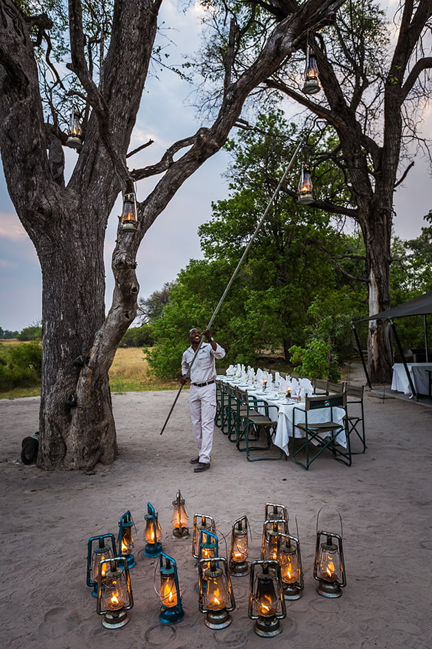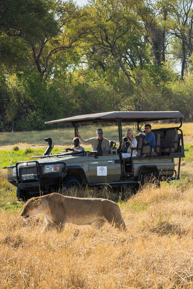 Pensión completa. Se incluyen dos actividades diarias: safaris en 4×4 abierto, paseos en mokoro y lancha (sujeto a los niveles de agua), paseos de naturaleza (sujeto a disponibilidad de guías especializados) y safaris nocturnos, que se realizan al atardecer para observar los animales más pequeños que se activan en la oscuridad.